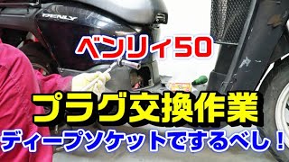 ※ちなみにHONDAベンリィのビジネスタイプは、通常のスクーターよりもプラグ位置が奥にあり、工具をきちんとしておかないと作業に時間がかかります。